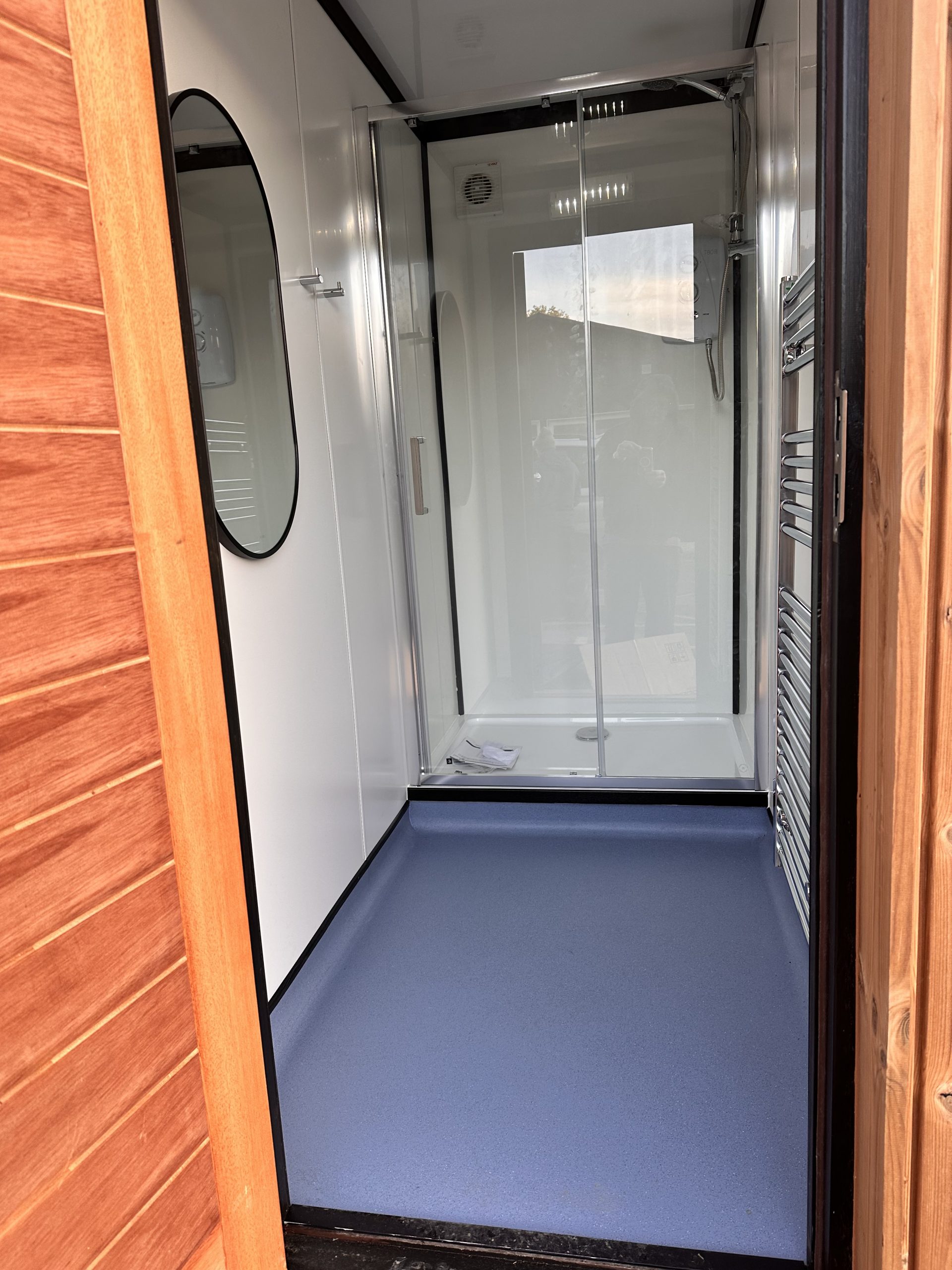 Often combined with toilets to form one block, the shower units are offered like the toilet units as either single person external door or as cubicles. The units are able to have either electric or lpg water heating as well as a single large cylinder or individual units. All shower areas are covered in 2mm white plastic sheet walling. As with all our site facilities, we can clad in timber, cement board or metal rainscreen.