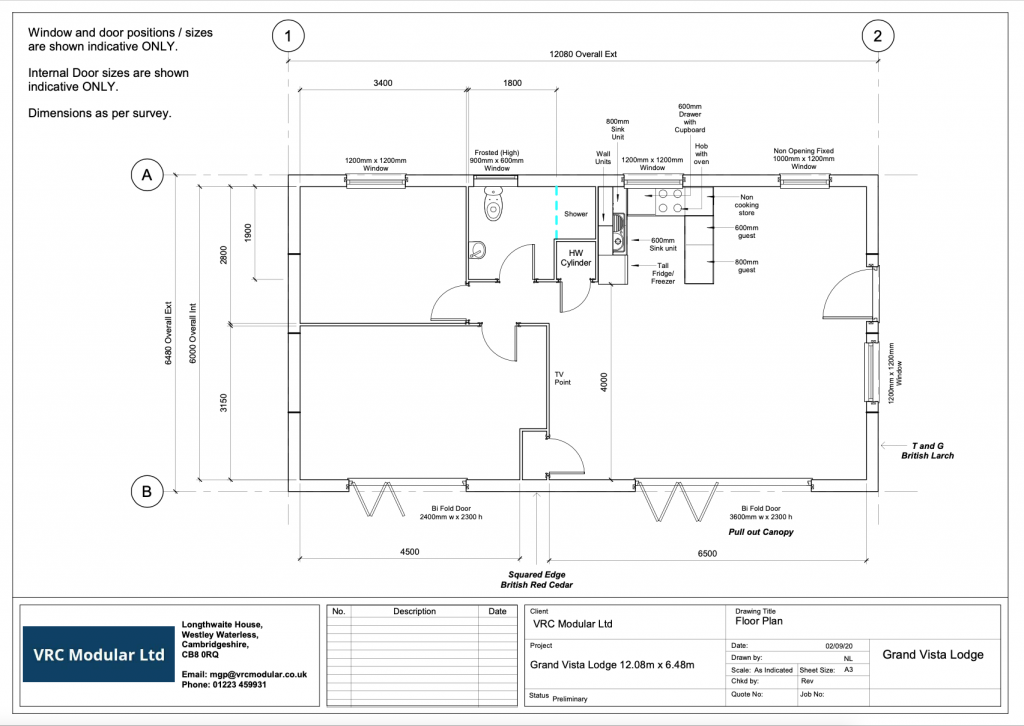 The name says a lot. Over 12 metres long and just short of 6.5 metres wide, this fabulous lodge makes a statement with the 6 metres in total of BIFOLD doors. Unlike the Studio Vista and the Vista Lodge the interior is clad in tongue and groove British Larch. There is plenty of space for dining and lounging on settees. This lodge size can be re configured to have three bedrooms.