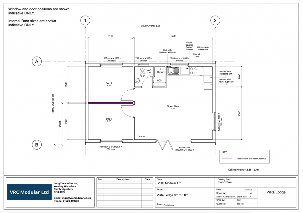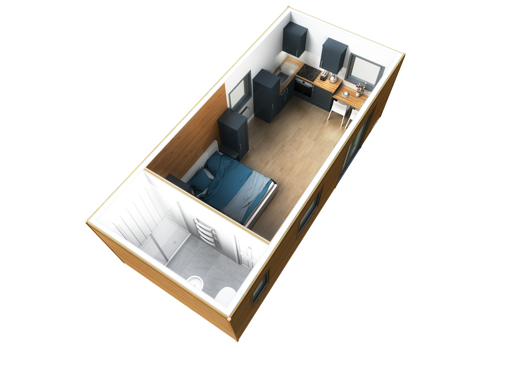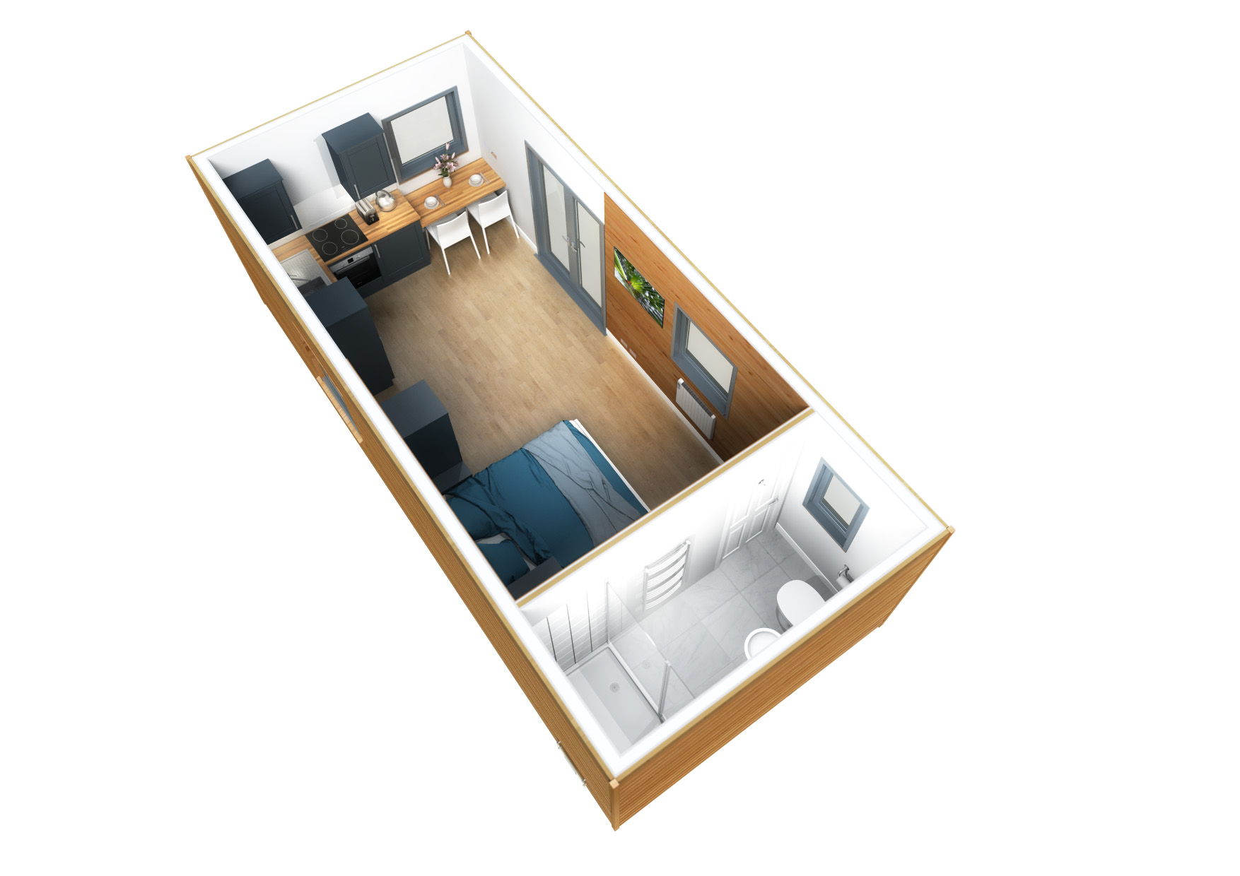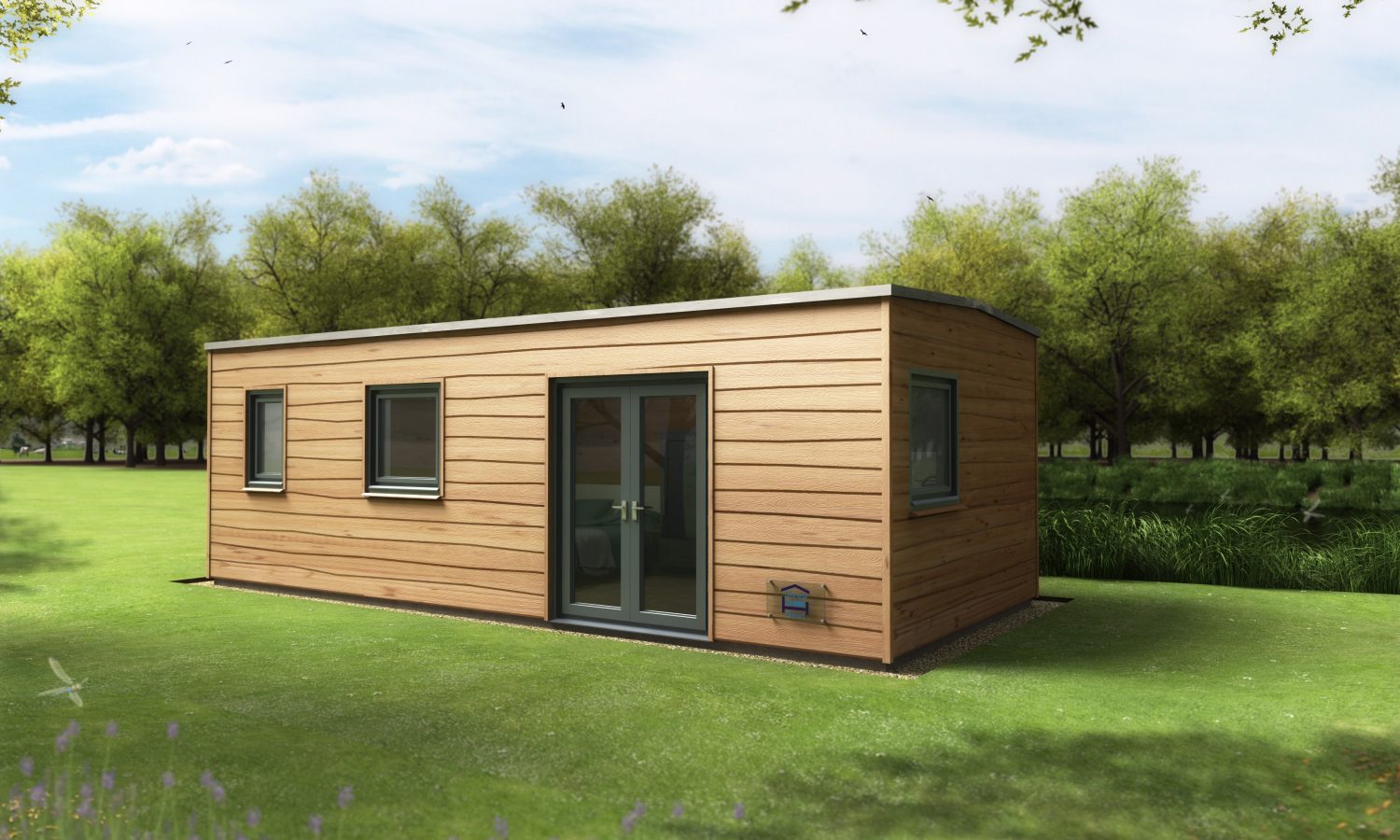 At 9 metres long and 5.8 metres deep this two bedroom lodge has a Sweet Chestnut feature wall in each bedroom. With a family bathroom including a 1,400 mm wide shower, this module is ideal for the holiday market. Having a well equipped kitchen and plenty of lounge space overlooking the 2.4 metres of BIFOLD doors, the clients will fi nd plenty to like. Clad in British Red Cedar, and with the pitched sheet mineral roof, this is a great investment.