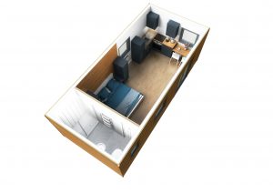 The standard insulation is 75mm PIR sandwich panel in the walls with additional mineral wool slab insulation. The low pitched roof has both 50mm of PIR and a total of 100mm of mineral wool slab insulation. The floor has mineral wool insulation in the steel frame cassette. The exterior cladding is waney edged Red Cedar, the roof a sheet membrane. The floors are engineered solid timber non slip planks.